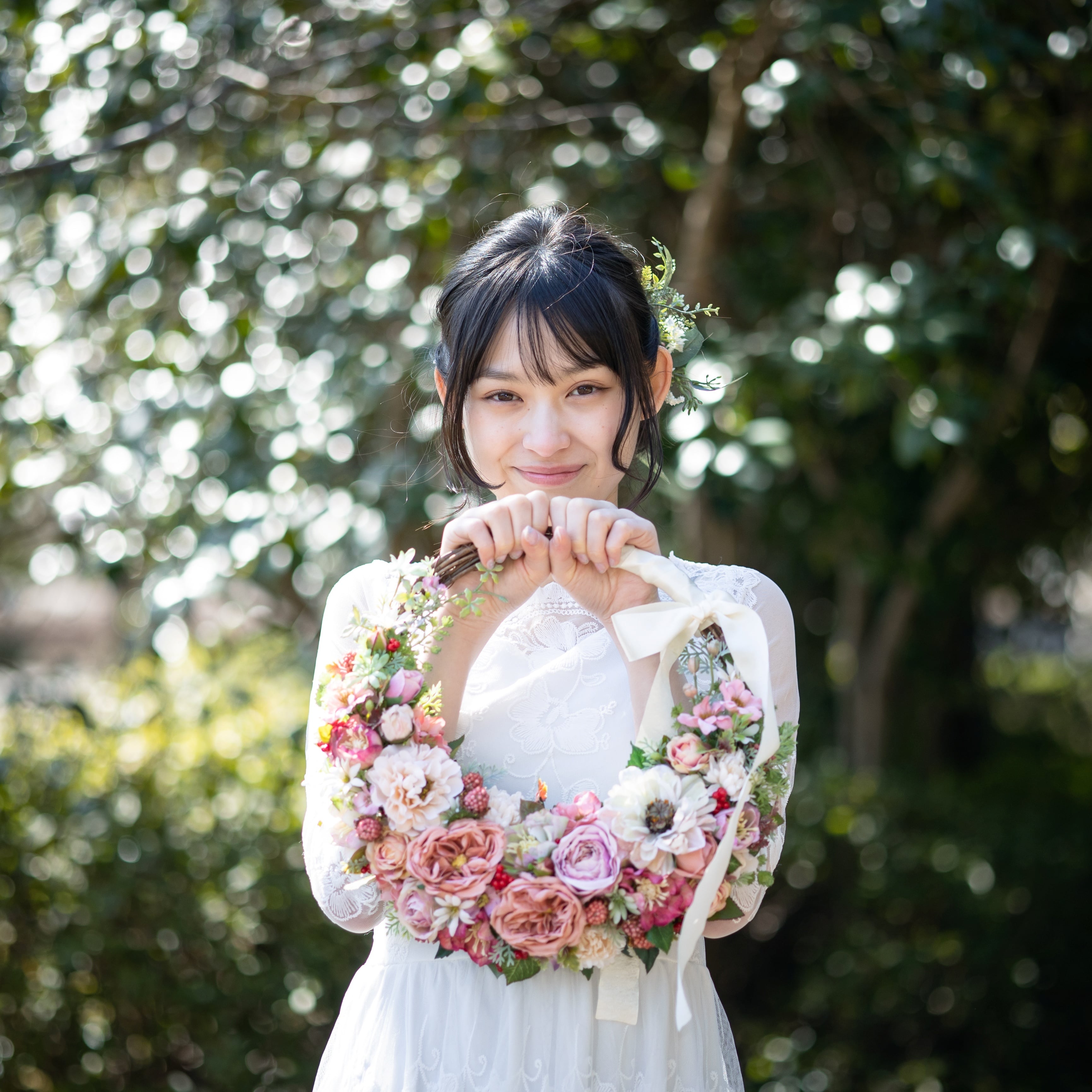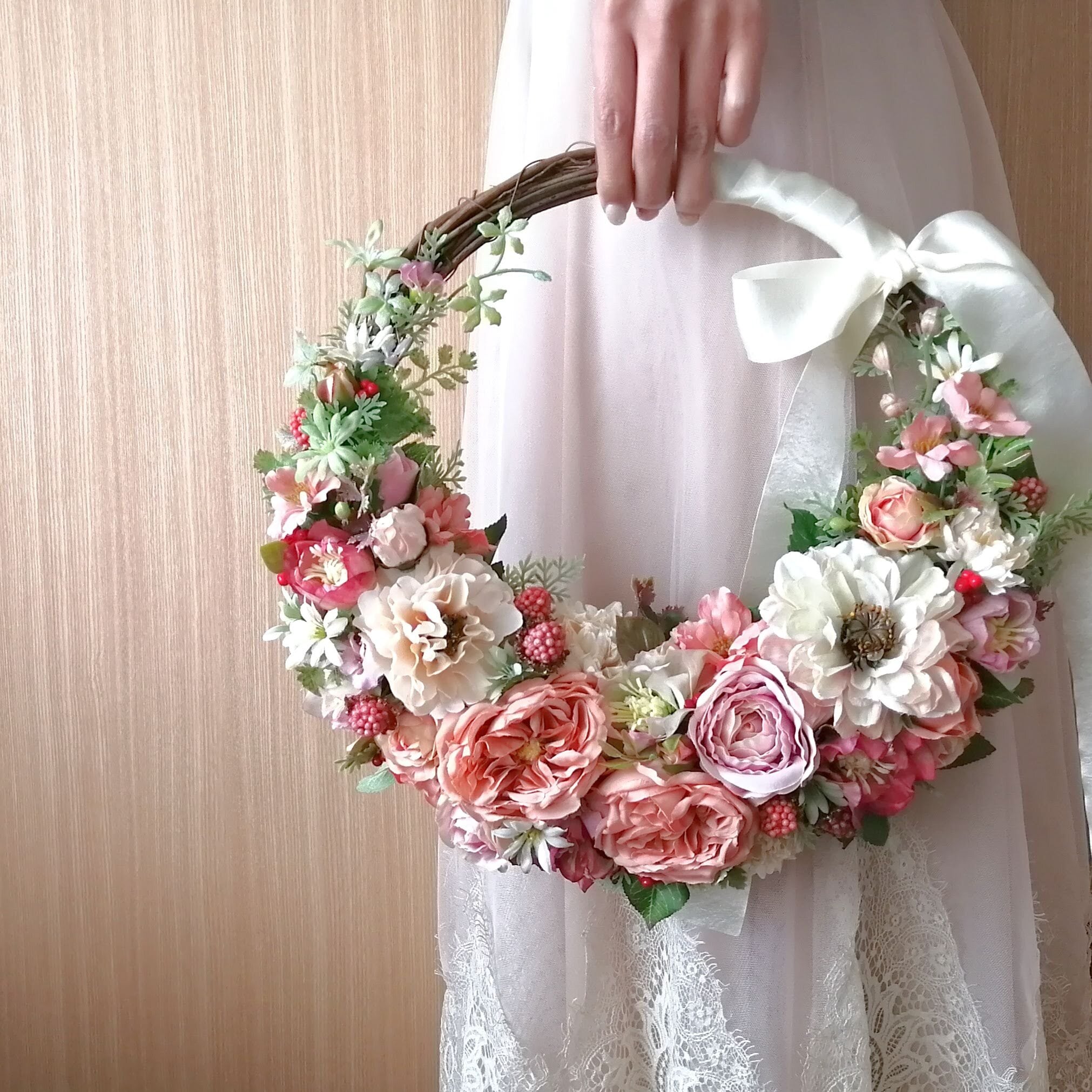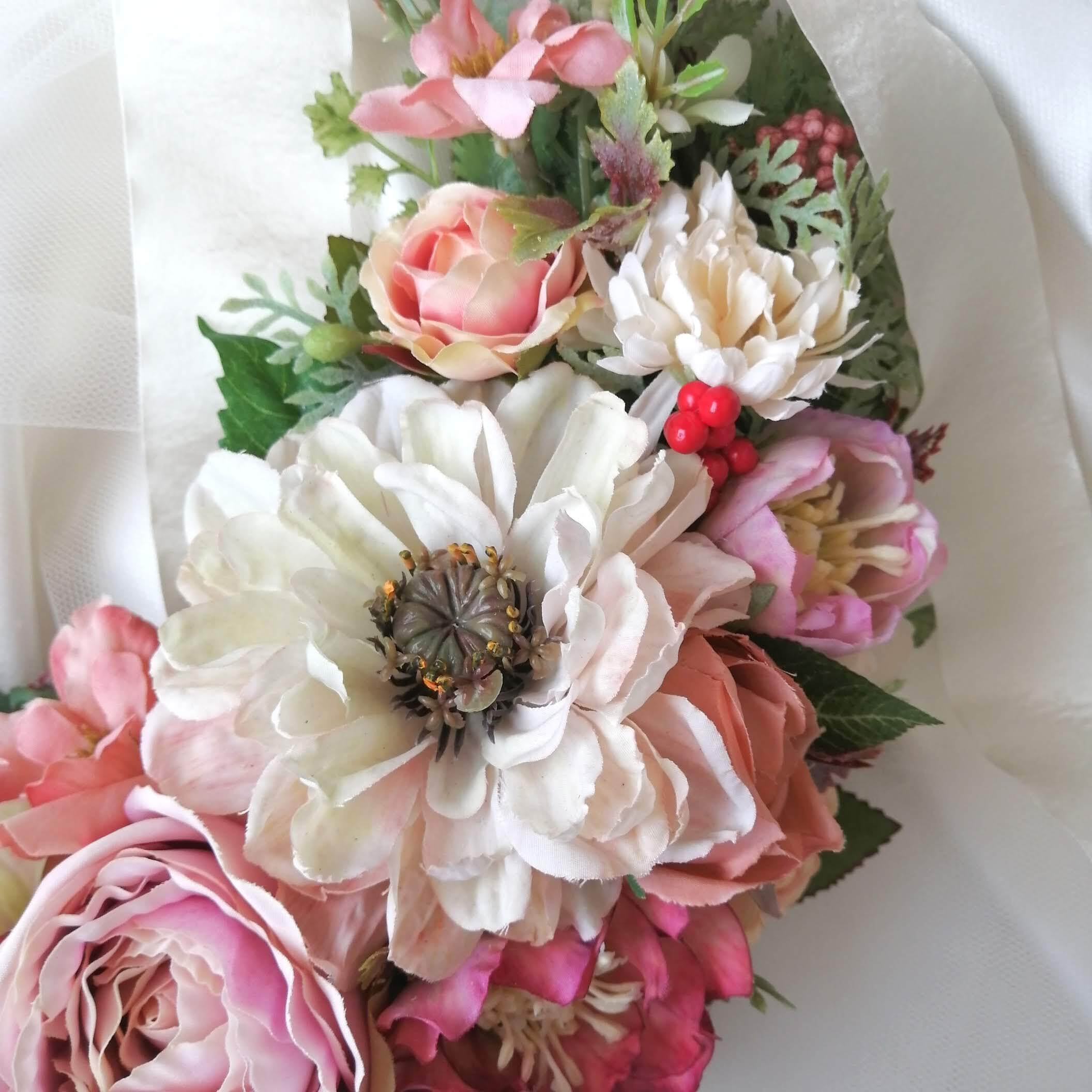 こちらのリースブーケはくすみカラーを使いながらもオレンジやピンクなどで華やかにまとめた大人可愛いブーケです。