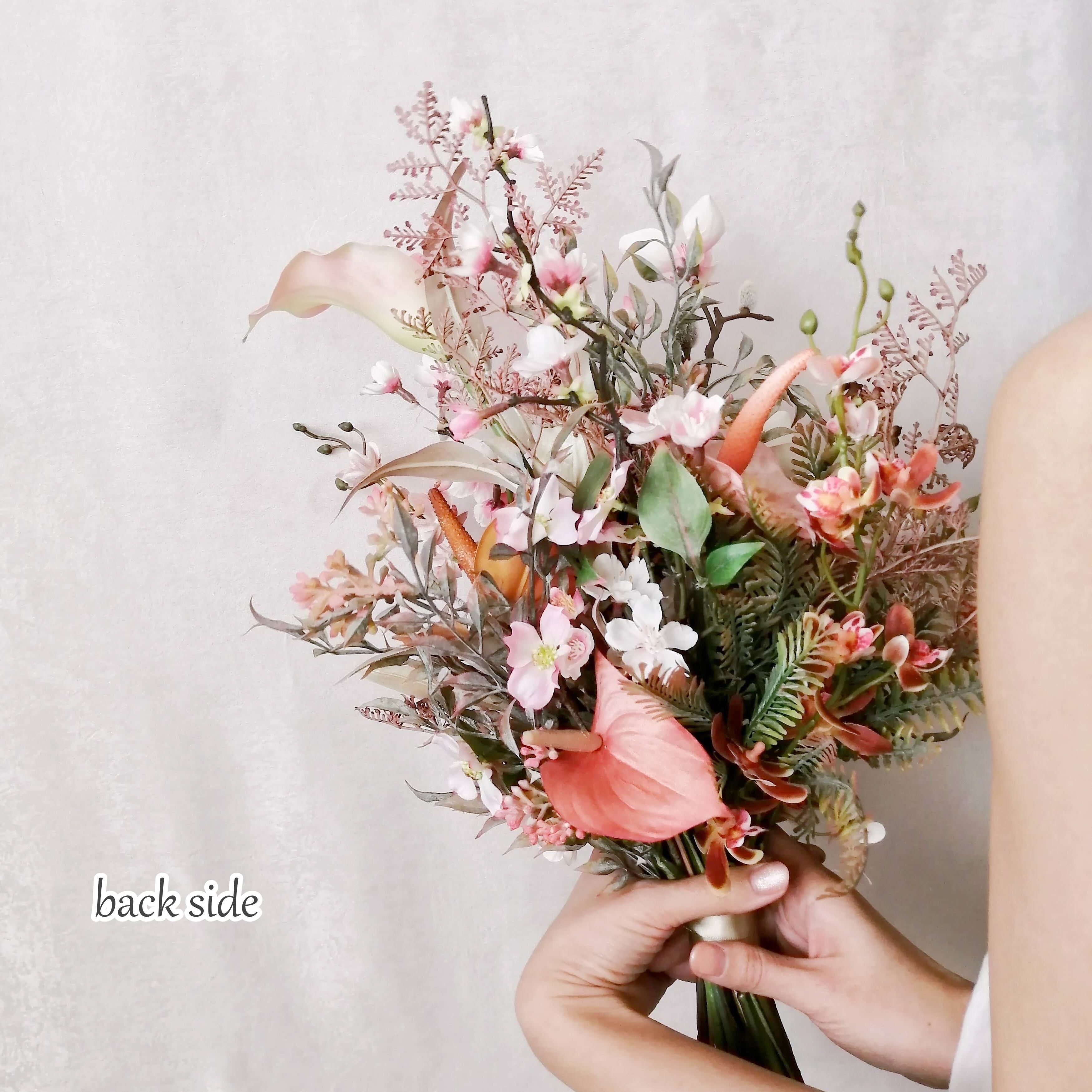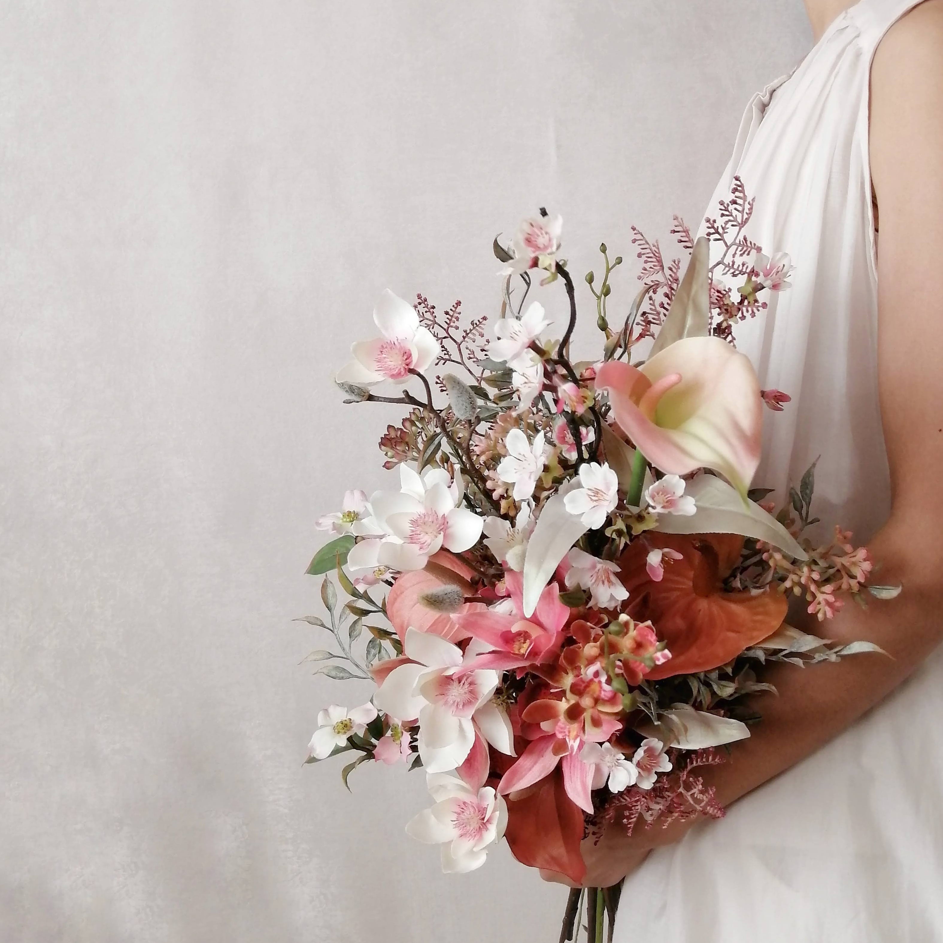 枝もののサクラ、木蓮、ハナミズキをトレンドのテラコッタカラーのお花と合わせ縦型ブーケにしました。
